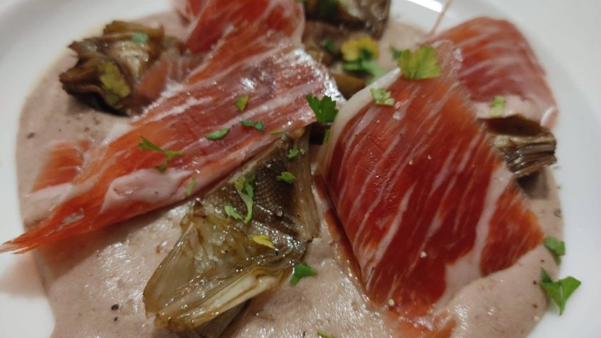 Alcachofas confitadas con parmentier de alcachofa y jamón ibérico: la elegancia de lo sencillo