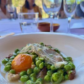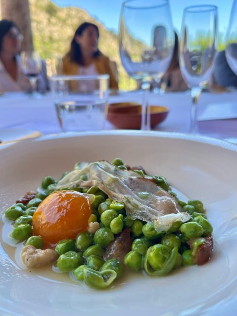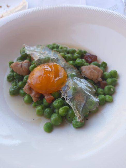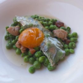 Guisantes con mollejas de cordero, papada de cerdo y huevo curado
